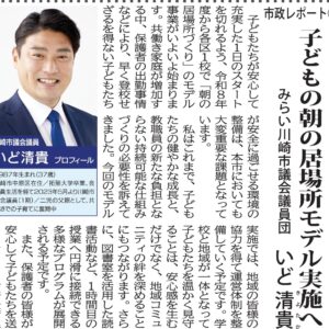こんにちは。いど清貴です。 先日(4月17日発行)の地元広報誌「タウンニュース」にて、私が市議会で取り上げた「子どもの朝の居場所づくり」に関する市政報告が掲載されました。 共働き家庭が増加する中、保護…続きを読む